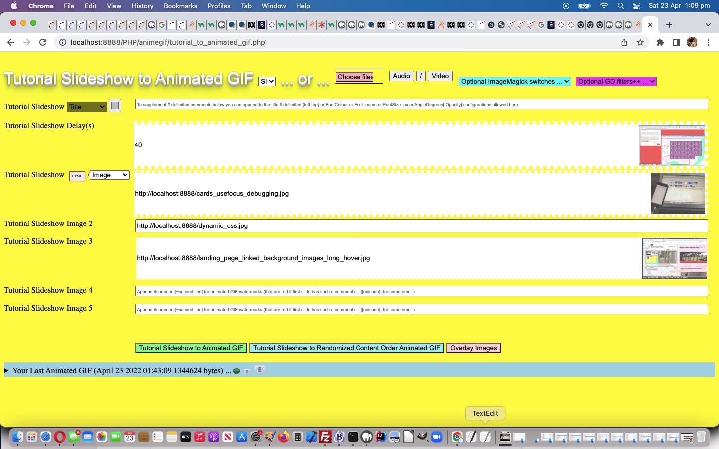 Then we added a more user friendly interface to get the information off the user we need. We present this in an HTML form, which navigates to the same PHP to do the actual assembly of the Animated GIF via techniques where PHP writes PHP … and really needs to, to be useful.