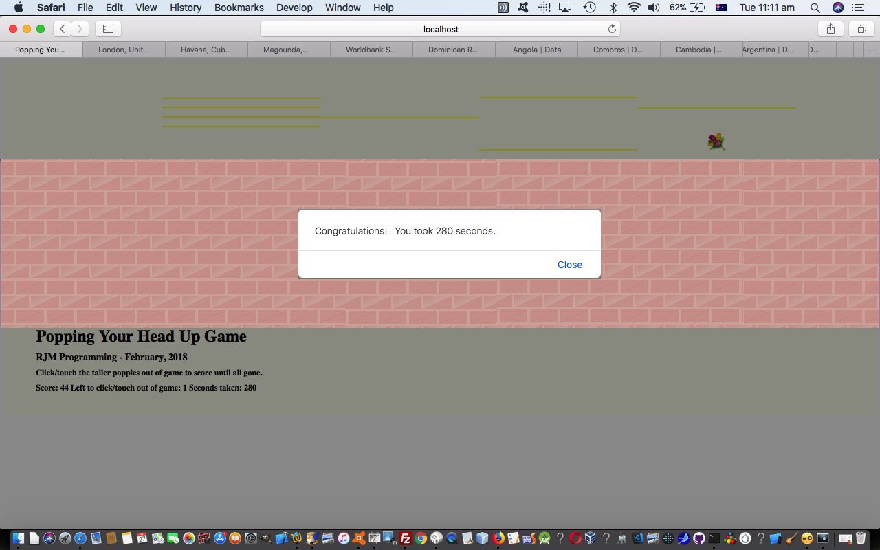 The game today consists of HTML and Javascript and CSS within the popping_your_head_up.html source code, for your perusal. Thanks to this very useful link for the brick wall ideas.