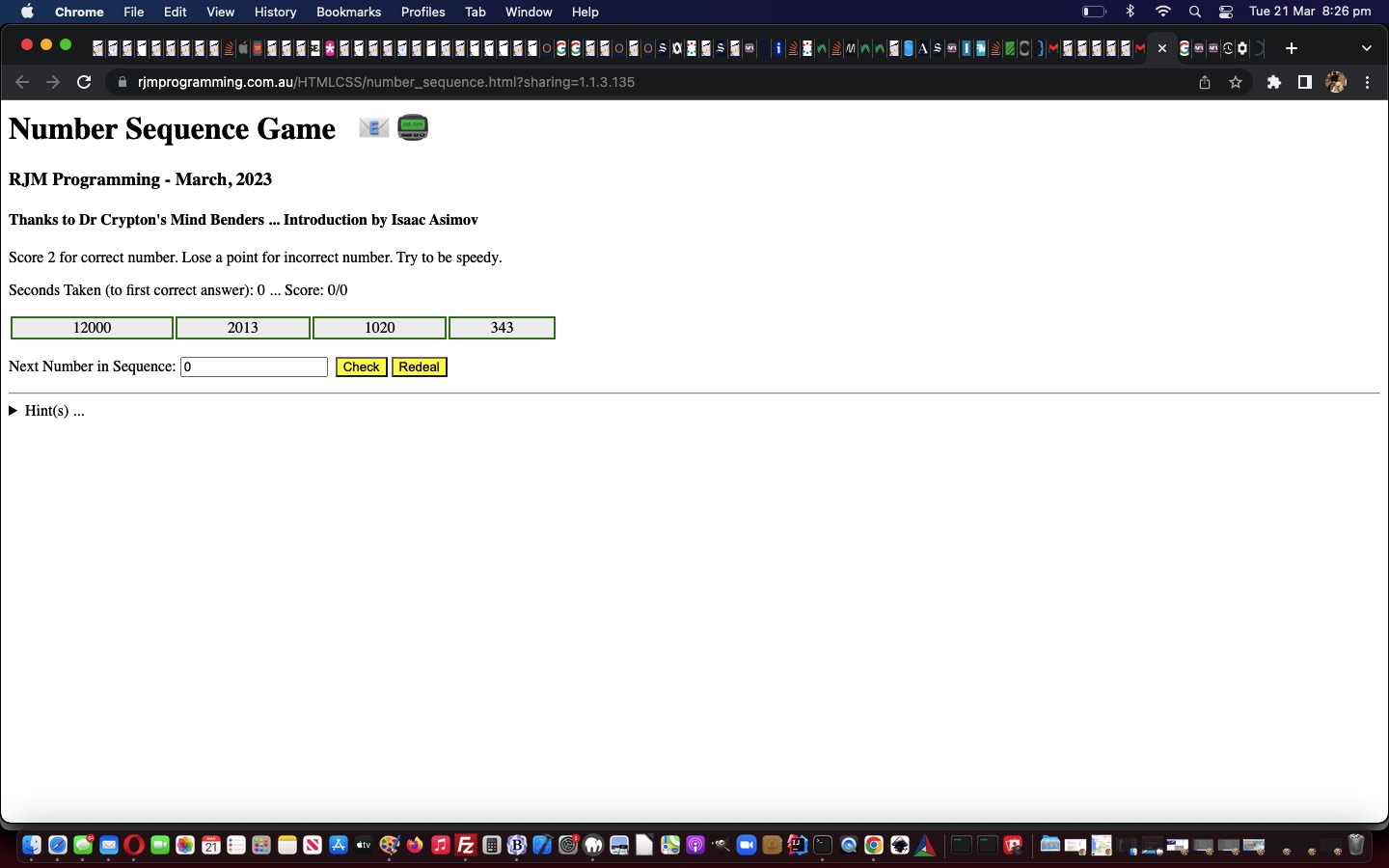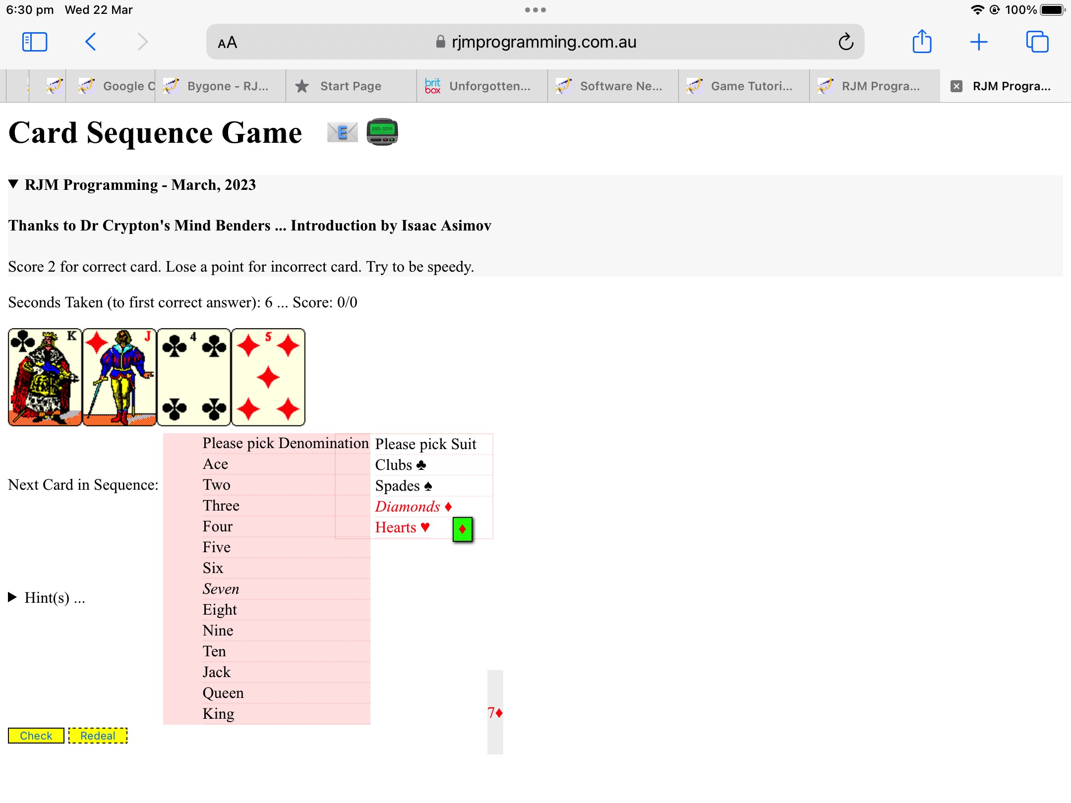 During the day before yesterday’s Card Sequence Game Multicoloured Dropdown and Mobile Tutorial we kept a snapshot of the code aside. Why? Well, it suited as the clone to work with, in order to develop today’s new Number Sequence game we were inspired by Dr Crypton’s Mind Benders, Introduction by Isaac Asimov (ISBN 0207146144) to write.