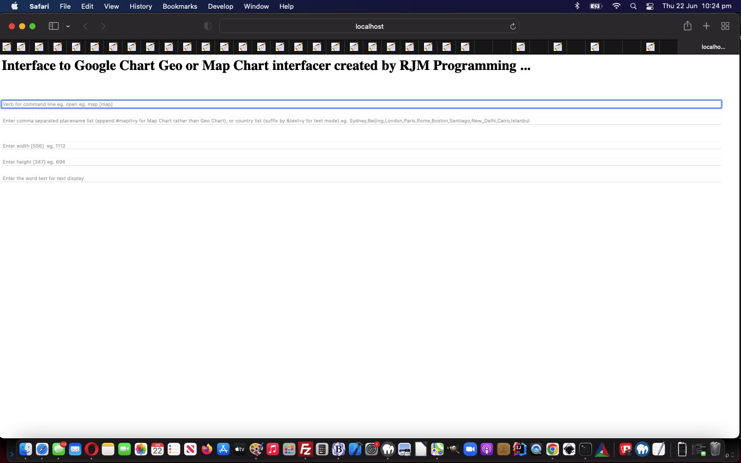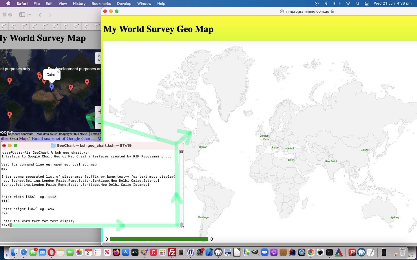 … the former being great for overall world map views or country views and the latter for distributions of geographicals zoomed in upon, as well as having user “pin” click controlled inhouse functionality extensions. So, with our macOS interfacing as the first cab off the rank we wanted to allow that Korn Shell script we created back then, called geo_chart.ksh, be changed so that the user can interactively enter data whereby they might get to a Map Chart presentation via the Geo Chart, in the case of the “text” presentation mode being the go, the user may see both types of Google Chart be displayed …