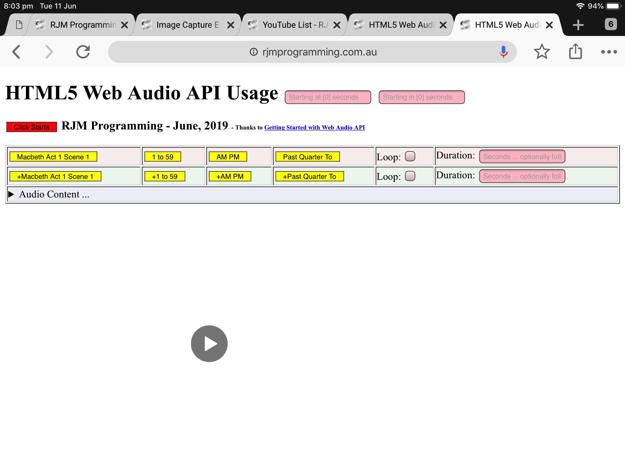 … and it should be noted here, that a separate file for each unique sound, could be a good alternative design, and would stop failures to do with the slow loading speed of the home web server causing audio misfiring … and would mean, below, that “astart” is always “0” and “delay” should be set to the audio object’s duration parameter - variables “astart” and “delay” as per example …