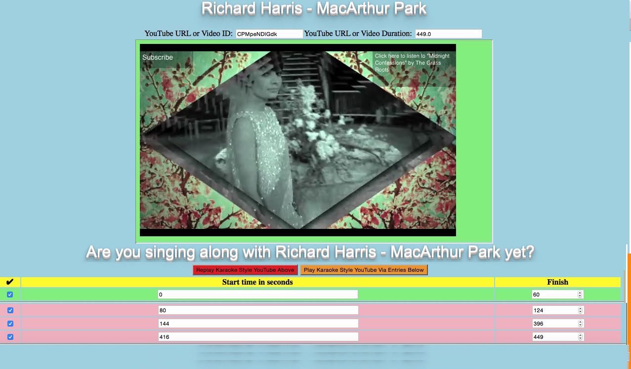 Today’s featured execution of the resultant HTML and Javascript (grand)parent karaoke_youtube_api.html web application has this generic live run but as a special treat for any “sweet green icing” fans … know I am … the link below waits 3 times for you to sing …