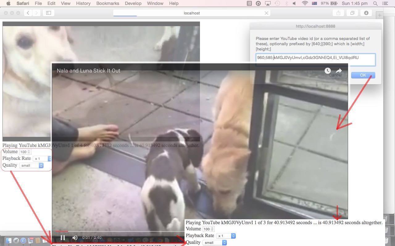 … and let the brilliance of the YouTube API add all this great “linked (video) list” functionality (you can see working in today’s tutorial picture) to our (still only) HTML and Javascript web application you could call stop_start_youtube.html, changed from yesterday in this way with its live run link for you to try this “playlist” functionality out for yourself.