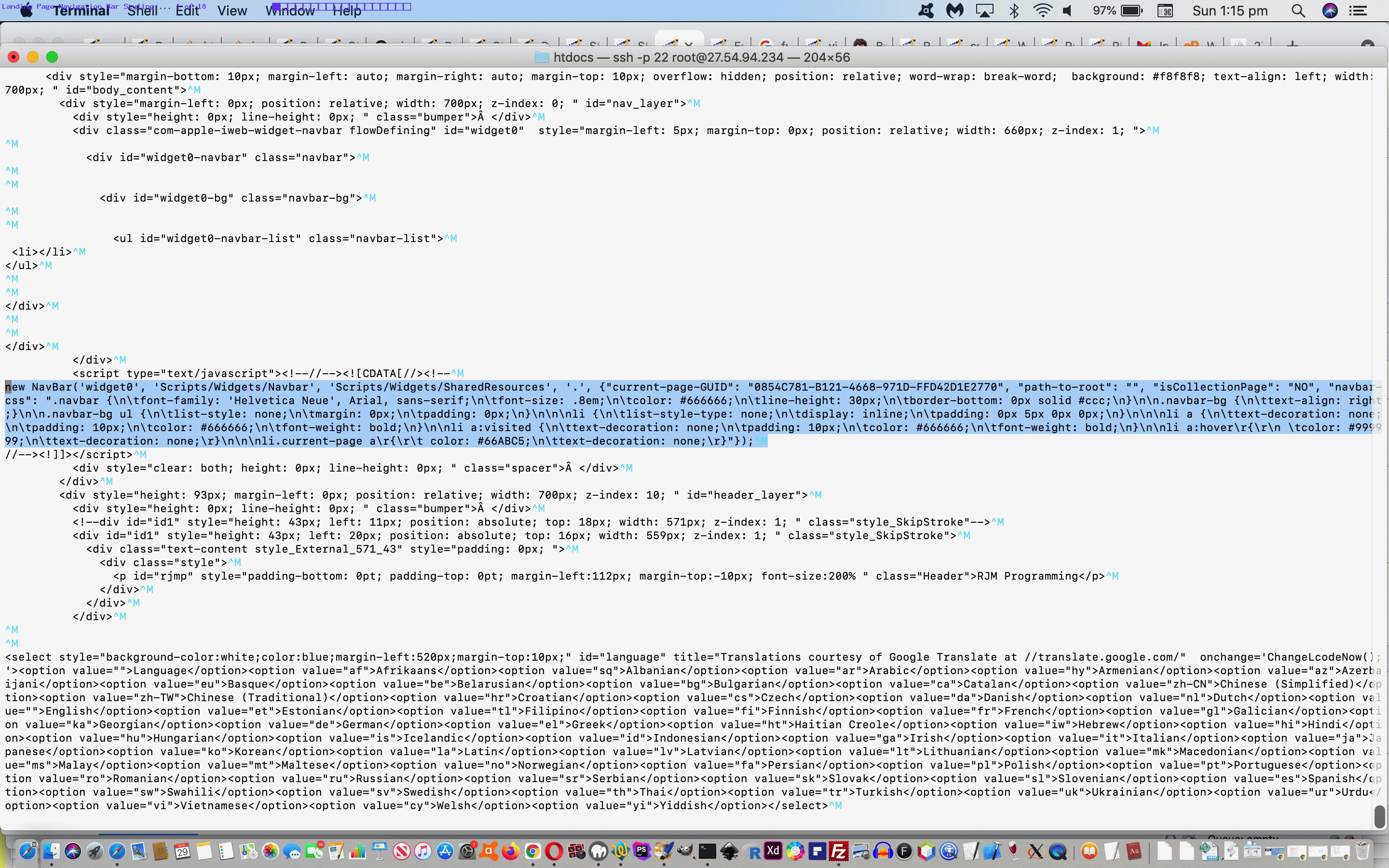 - ssh session vi editor editing up at the RJM Programming domain web server (staying in session via “:w” saves between tweaks) … combined with …