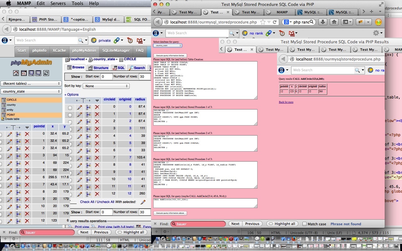 Today’s tutorial follows up on phpMyAdmin interface to MySql and PHP Primer Tutorial in that we again use the brilliant phpMyAdmin to oversee the results of some PHP code which uses MySql calls to create tables called POINT and CIRCLE used to store information defining a circle, and then it creates three MySql stored procedures in the database to help add circle data with the single MySql statement that goes CALL AddCircle(x, y, radius); via the use of those stored procedures. Let’s see below what Wikipedia says about Stored Procedures generally.