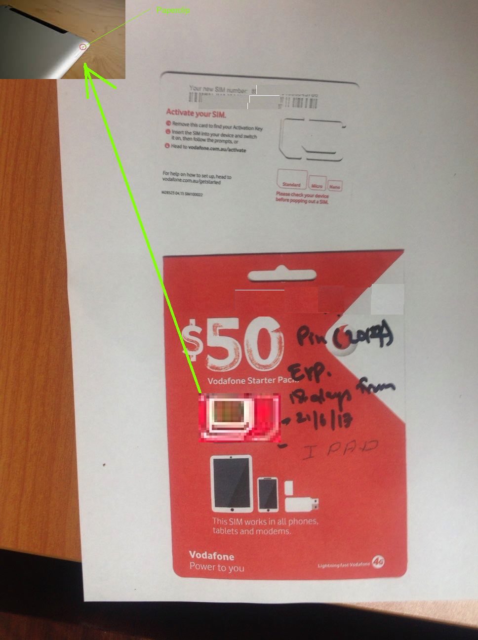 - pull out the Sim card (with its cardboard backing in place)