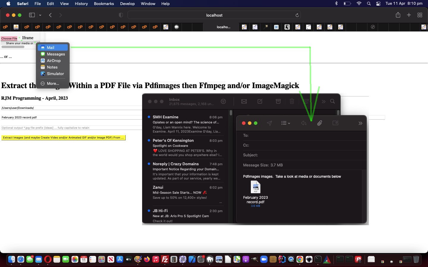 When we presented Web Share API Primer Tutorial some time back we remember palpable excitement that a means by which email attachments could be linked to “a” link “mailto:” looking user controlled email sending (as well as several other sharing options, adding to “Mail”, those being “Messages”, “AirDrop”, “Notes”, “Reminders”, “Simulator”, “Notes”, “More…” here on this macOS MacBook Air, that you might not have thought of to use, all presented on a menu created by the Web Share API) could be at hand. Alas, this “Web Share API” methodology is not supported on all browsers and platforms and protocols. Nonetheless, we want to incorporate it where usable because we have the idea, now, to set up web application design scenarios such as …