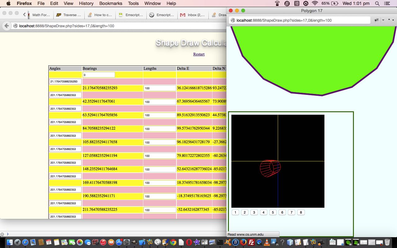 To infinity and beyond!! … well, at least to the 3rd dimension … yes, we’re rejoining our Geometry and Land Surveying theme today, rejoining the discussion of PHP and Javascript and CSS Shape Rotation Tutorial as shown below, but giving some additional functionality to show the Convex Polygon shape with an added dimension by displaying its 3D prism equivalent via the WebGL API, modelling the additional code via the public generosity and wonderful resources from the University of New Mexico … our heartfelt thanks.